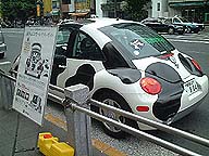 ■これがホントの牛車 ゲートウェイ2000でPERFORMANCE JSシリーズの誕生を記念してモーレツプレゼント。フォルクスワーゲンのカウスポットニュービートルが当たるキャンペーンを実施中。その景品の車が路上に駐車してました。 こんなの当たって嬉しい人いるのかな? ミルねーさん以外にとても乗れません(笑) |
