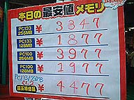| ■メモリの価格が下げ止まらない いや〜今回のメモリの大暴落は異常ですね。 メルコやI/O DATAなどのブランドメーカーが最大70%もの値下げを行うことが、メモリ市場の局所的な値崩れが今までの過去にない異常事態を物語っています。 今回の大暴落の要因として様々なことがいわれてます。 ・米国でのパソコン販売の低迷。 ・韓国メーカーがメモリを大量に放出。 ・メモリメーカーの生き残りを架け、再編を睨んだ戦略。 でもやはり真相はPentium4の普及に伴いRamBus仕様のメモリがとうとう動きだすことにより、長く続いていた168pinDIMMの在庫処分が始まったことにあるようです。 ユーザーにとってはとてもありがたいことですが、販売する店やメーカーにとっては今回の暴落は地獄絵図をみてるようです。 |