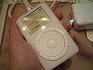 | Topics ■InterBEEでiPod発見! いよいよ本日(17日)に発売されるアップルのiPodですが、 14〜16日まで幕張メッセで開催された国際放送機器展(InterBEE 2001)に出展してたアップルブースで発見! 早速触らせていただきました。 裏面は鏡面のようですが、指紋がべたべた状態になります。 思っていたより小さく、親指だけで操作できるジョグダイヤルはなかなか使いやすいです。 |