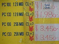 ■メモリ反発 WindowsXPの発売に伴い、千円割れしていた128MBのメモリが一気に2倍に。 それにつられて256MBも1.5倍にと全体的に値上げされてます。 年内はこのまま上昇に推移するのか?それとも時間がたてばまた下がるのか? |