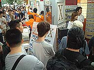 | 店頭ではカウントダウンが始まり10:02にクラッカーを鳴らして、いよいよ販売開始です。 | ぞくぞくと店内に入っていく購入者の列。 |
