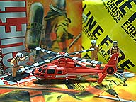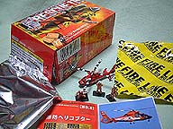 | 大きな箱からお菓子とおまけがでてきます。今回は8種類+シークレット2種の合計10種類。 | でてきたのは消防ヘリコプター。これ以外にボーナスフィギュアがランダムにつきます。 | 防災といえばカンパン。 ひさびさに食べるカンパンはおいしいけど、あまり数はたべれないな。 |
